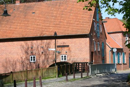 Die Mühle hat hier noch zwei Wasserräder, das eine ist mit einem Holzverschlag verkleidet, um es vor winterlichem Eisgang zu schützen.